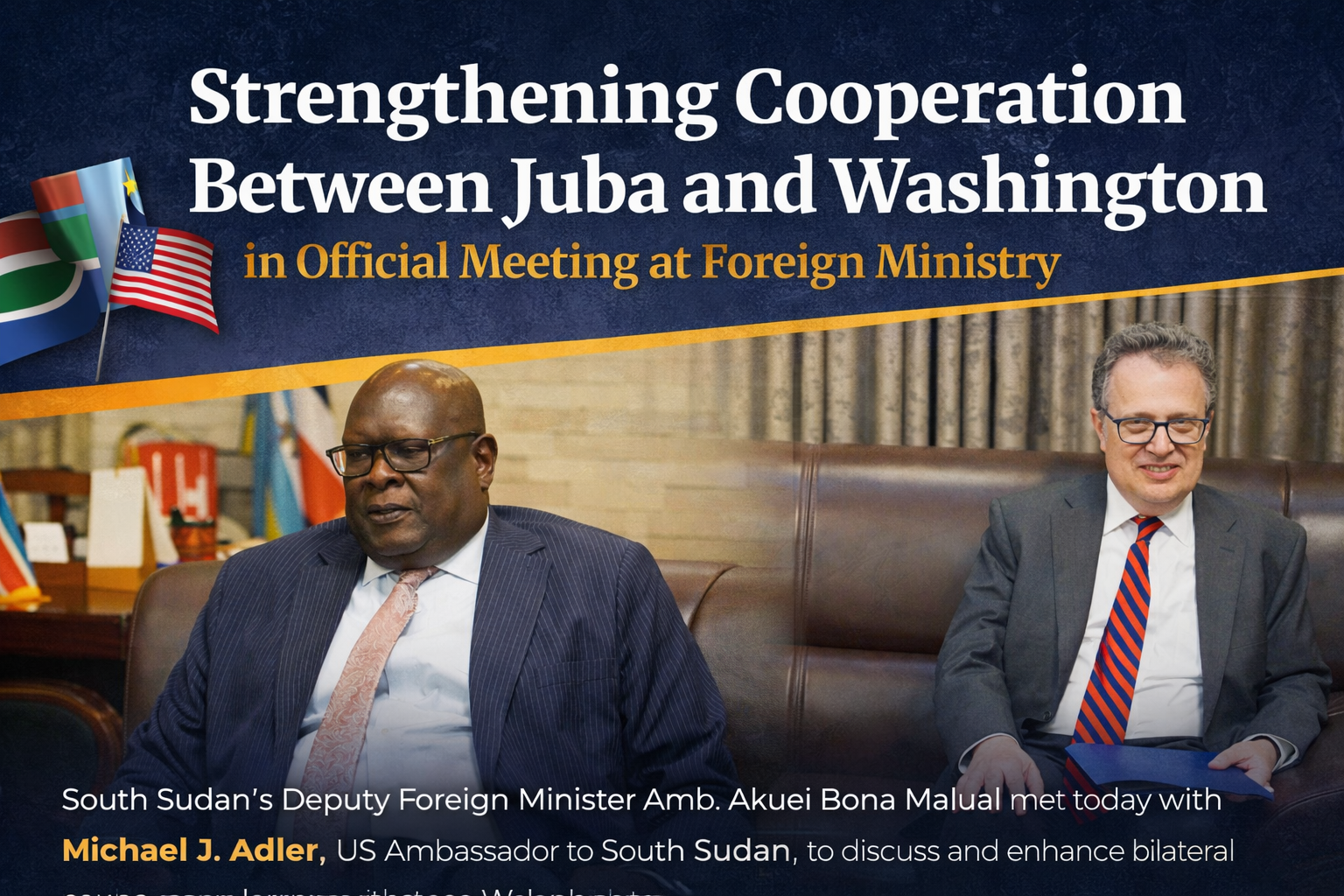 Juba – Al-Wadi Newspaper The Deputy Minister of Foreign Affairs and International Cooperation, Ambassador Akuei Bona Malual, discussed ways to enhance bilateral cooperation with Michael J. Adler, Ambassador of the…