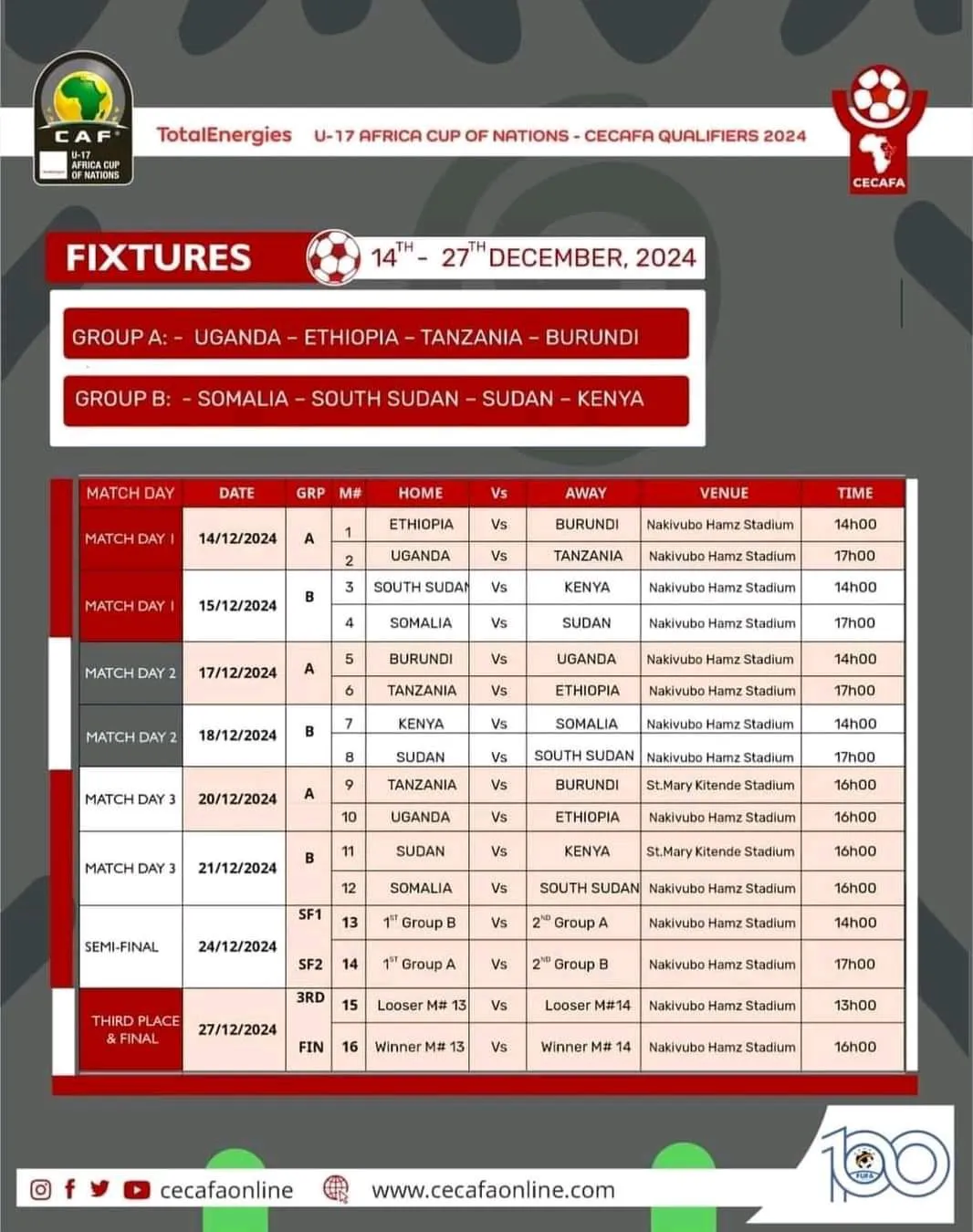 South Sudan’s U-17 national team will start their campaign in the East and Central Africa (Cecafa) qualifiers for the African Junior Nations Championship , which will be hosted by Uganda from December 14-29, 2014. The tournament will be hosted by Uganda from December 14-29, 2024.
