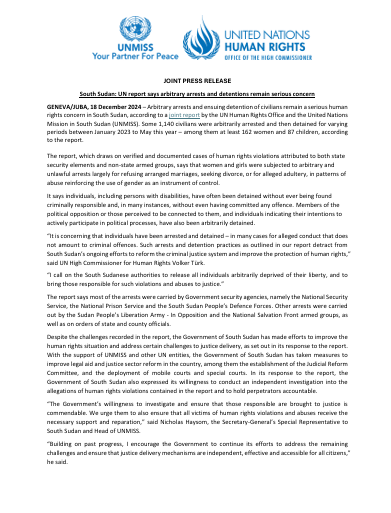 “It is concerning that individuals have been arrested and detained – in many cases for alleged conduct that does not amount to criminal offences. Such arrests and detention practices as outlined in our report detract from South Sudan’s ongoing efforts to reform the criminal justice system and improve the protection of human rights,” said UN High Commissioner for Human Rights Volker Türk.