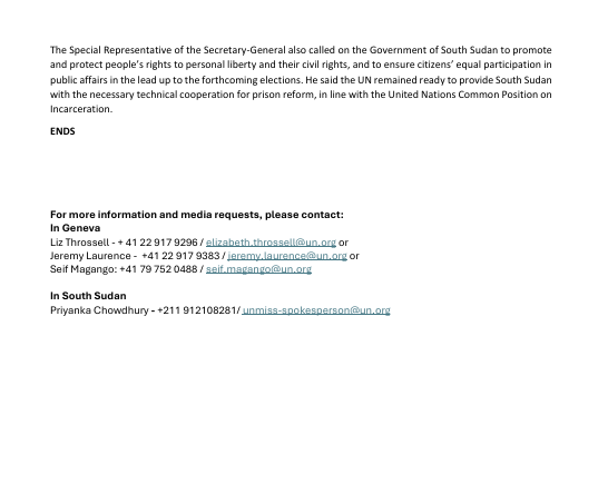 The Special Representative of the Secretary-General also called on the Government of South Sudan to promote and protect people’s rights to personal liberty and their civil rights, and to ensure citizens’ equal participation in public affairs in the lead up to the forthcoming elections. He said the UN remained ready to provide South Sudan with the necessary technical cooperation for prison reform, in line with the United Nations Common Position on Incarceration.