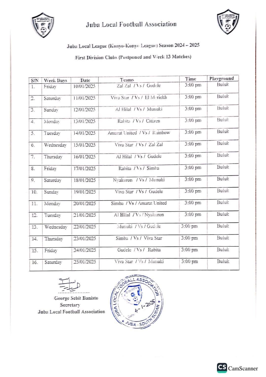In a circular signed by the secretary general, the JLFA set Friday the 10th of January as the start date for the postponed matches of the first round of the championship between Zelzal and Gudele, at 3:00 pm at the Buluk Playground.