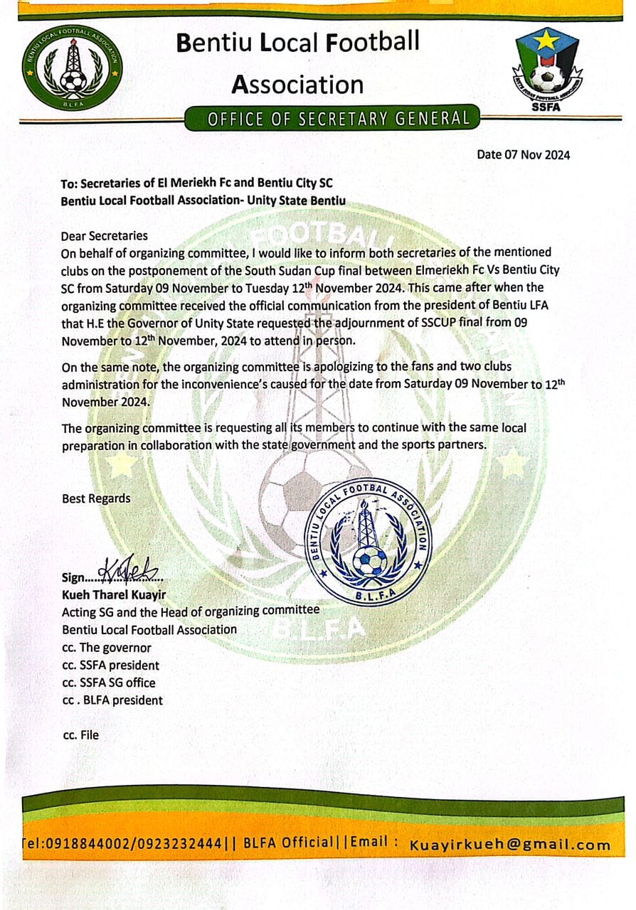 The local union notified the management of both clubs about the delay, explaining that it was requested by the governor of Unity State, Riek Biem Top, who intends to attend the match in person.