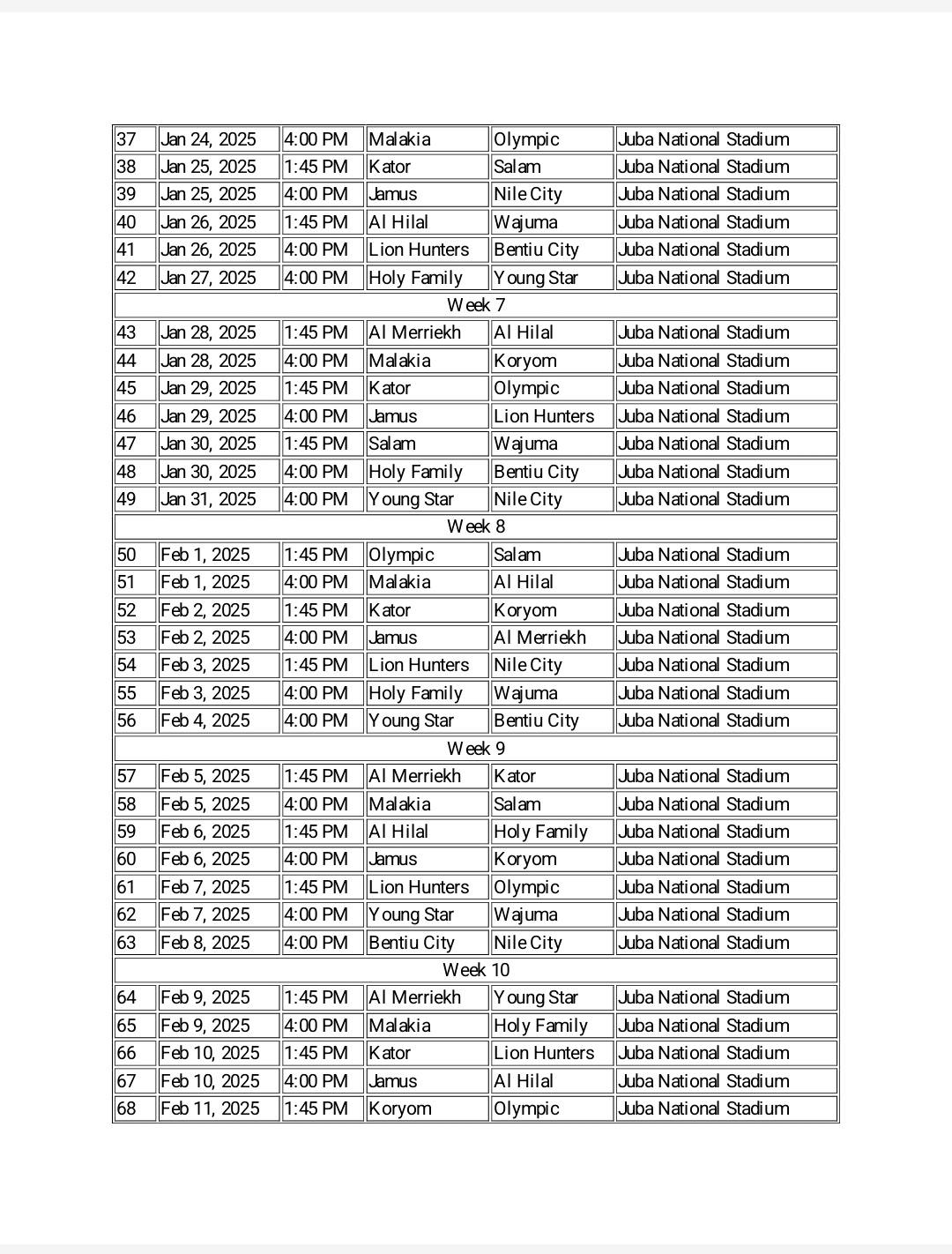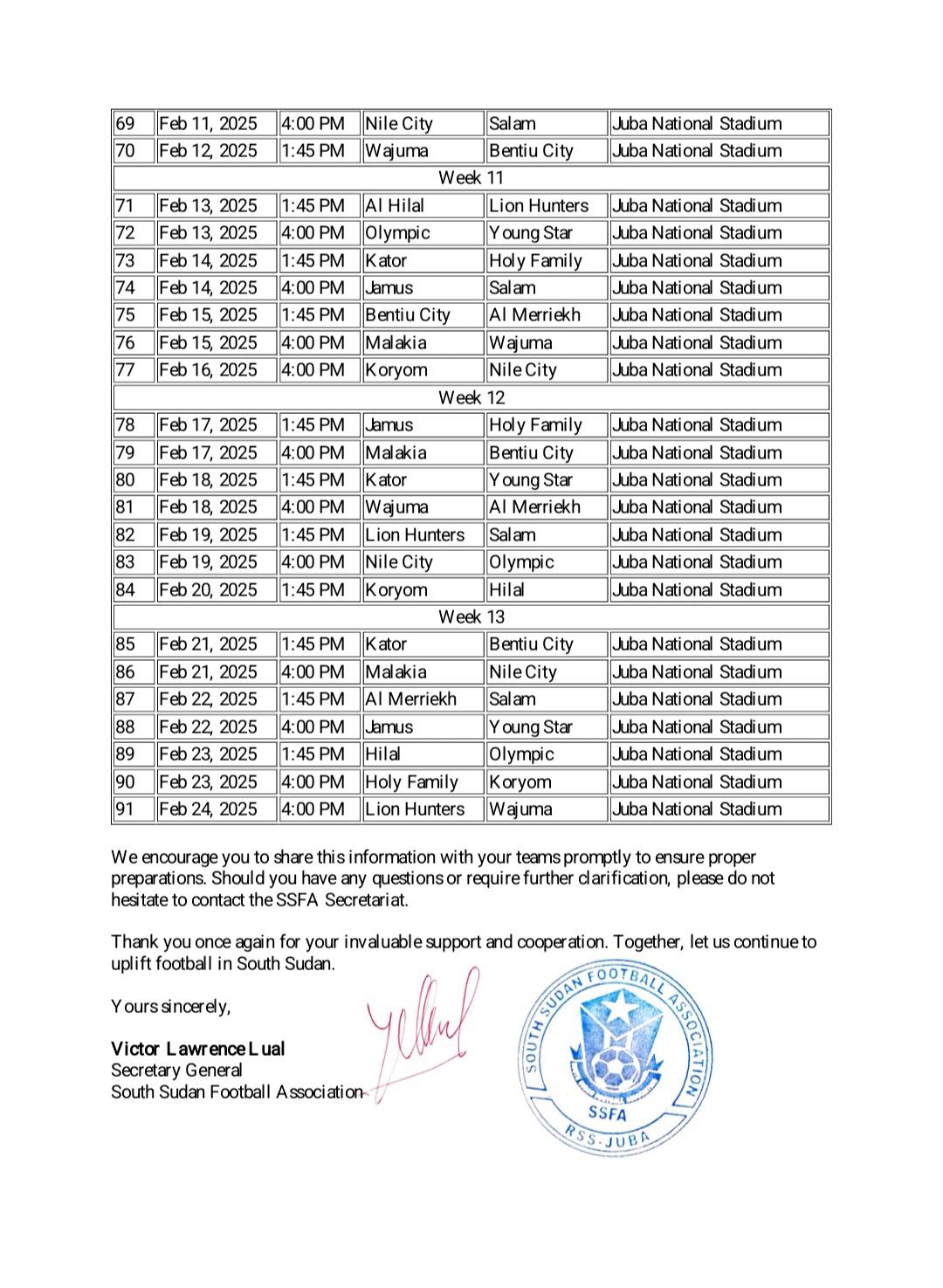 The first leg of the league will conclude on 24 February 2025, with Lion Hunters Yei and Wajuma Aweil playing at 4pm at the Juba National Stadium.