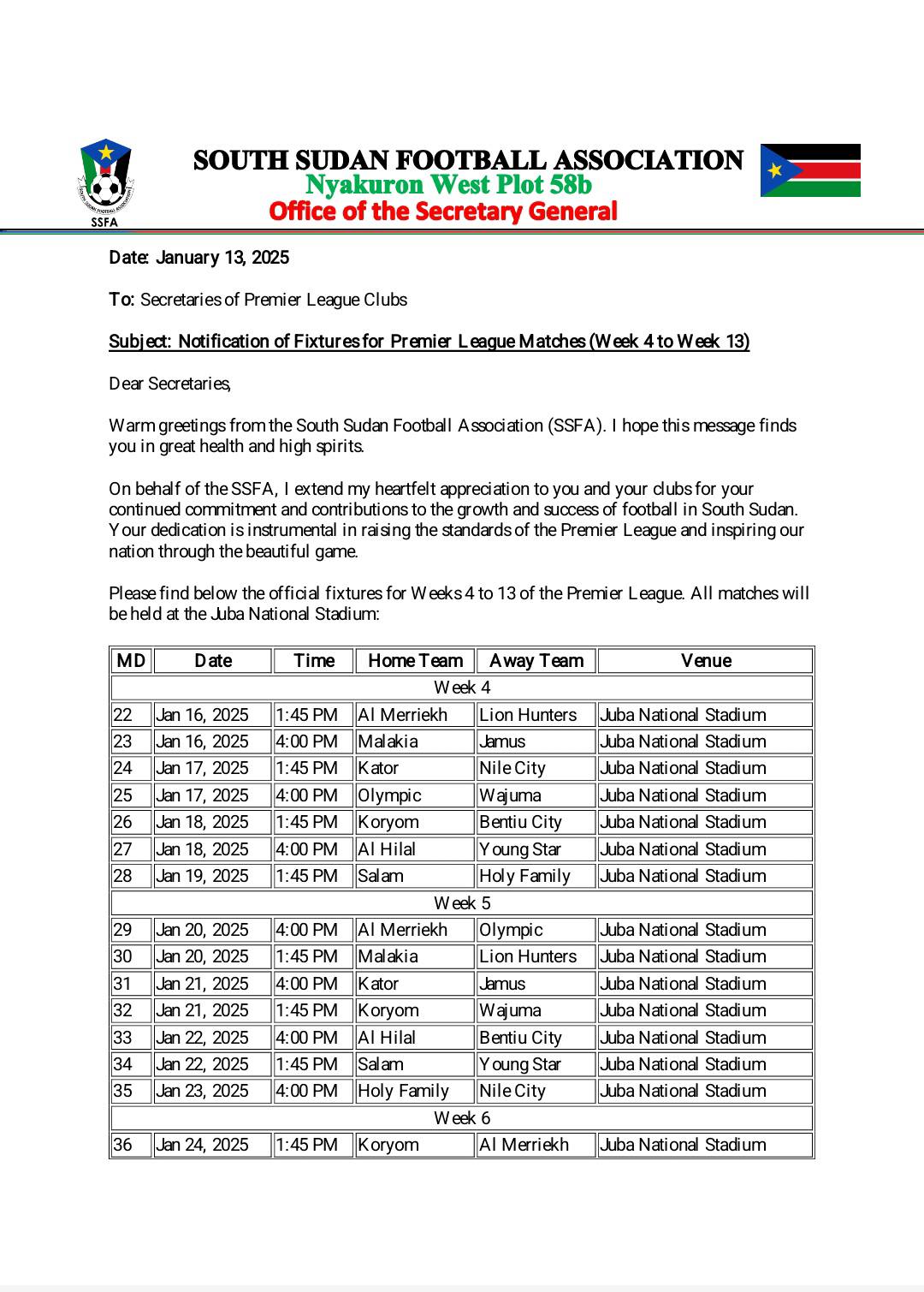 The South Sudan Football Association (SSFA) announced yesterday, Monday. The first leg of the South Sudan Premier League, starting from the fourth round to the thirteenth round of the competition.