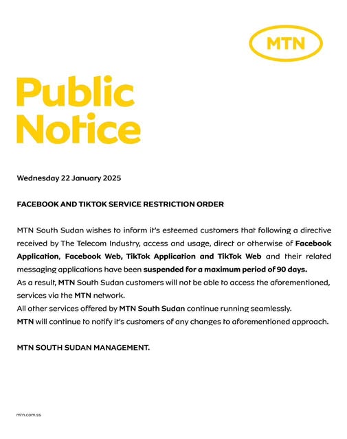 MTN South Sudan posted on its Facebook page that it had received notice of the order from the NCA due to the ongoing unrest in Sudan and its impact in South Sudan.
