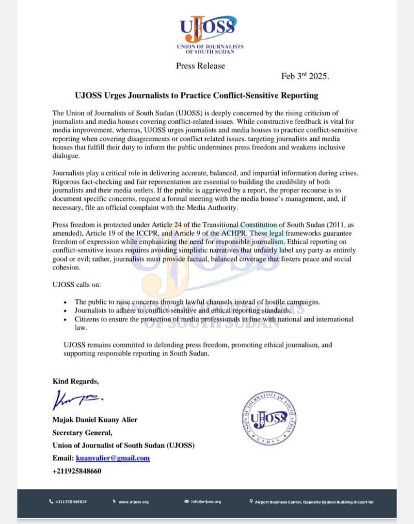The Union of Journalists of South Sudan (UJOSS) is deeply concerned by the rising criticism of