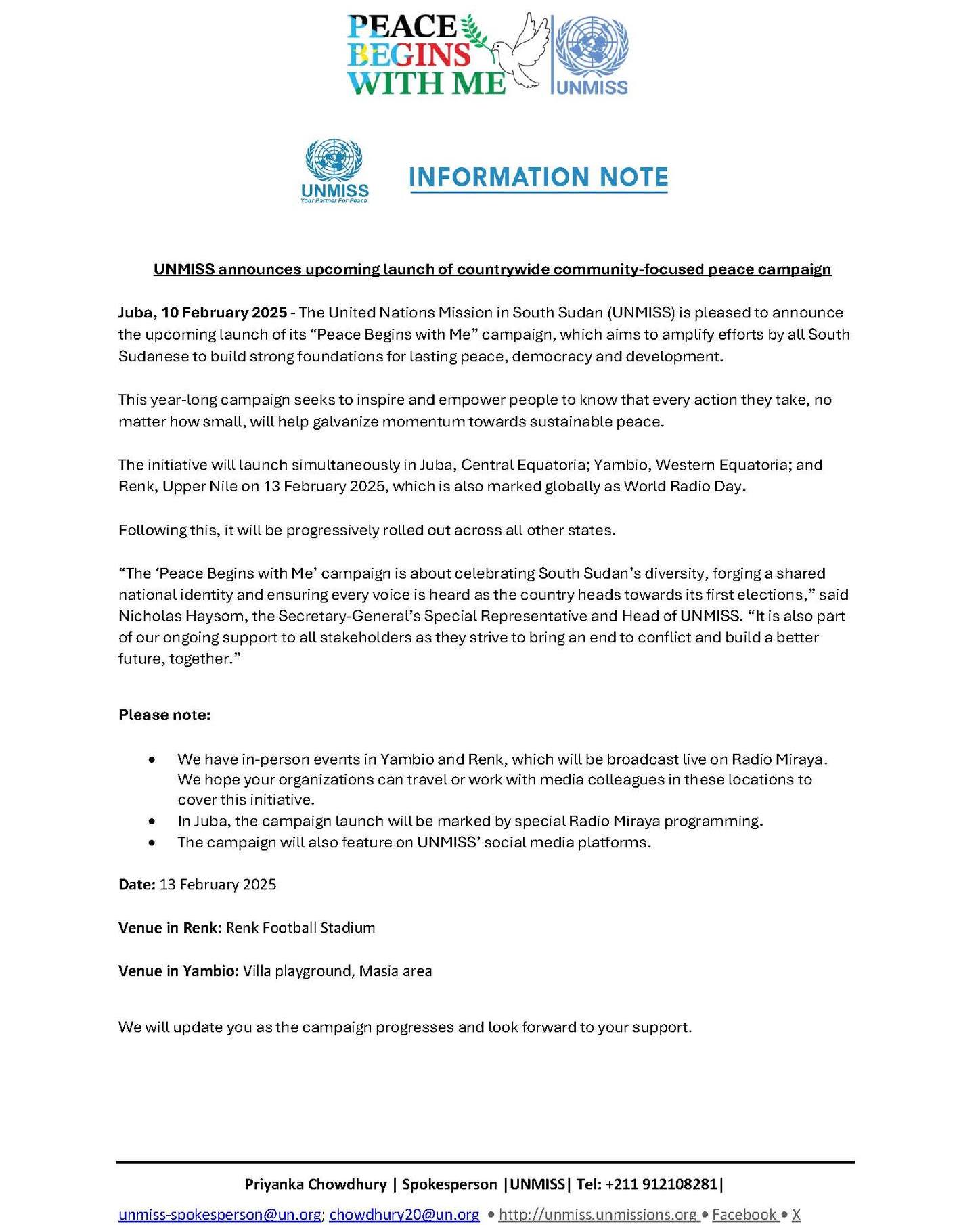 United Nations Mission in South Sudan (UNMISS) Announces the Launch of “Peace Begins with Me” Campaign to Promote Sustainable Peace and Democracy