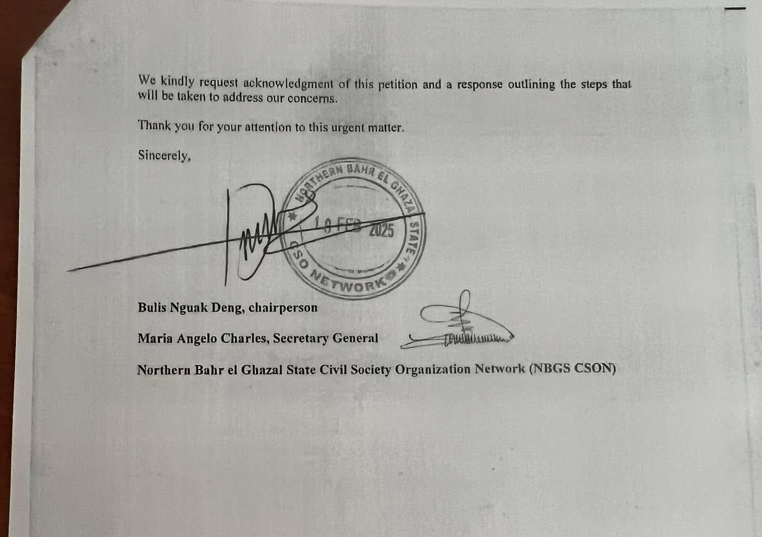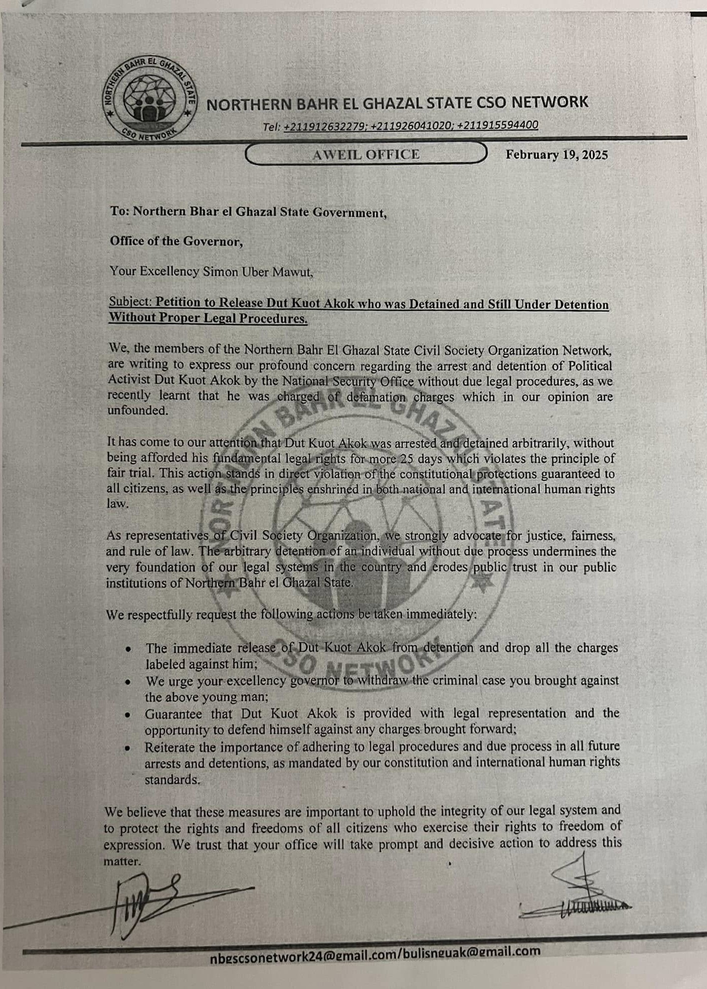 In the petition letter, it was stated that the members of the Civil Society Network in Northern Bahr El Ghazal are deeply concerned about the arrest and detention of political activist Dut Kuot Akok by the National Security Service in the state without following proper legal procedures. Deng mentioned that the detainee had been charged with defamation without concrete evidence. It was revealed that Dut Kuot was arbitrarily arrested without being granted his fundamental legal rights during detention, and he has been detained for over 25 days. This constitutes a violation of the principle of justice as outlined in national law and international human rights law. This act directly contradicts the constitutional protections guaranteed to all citizens.