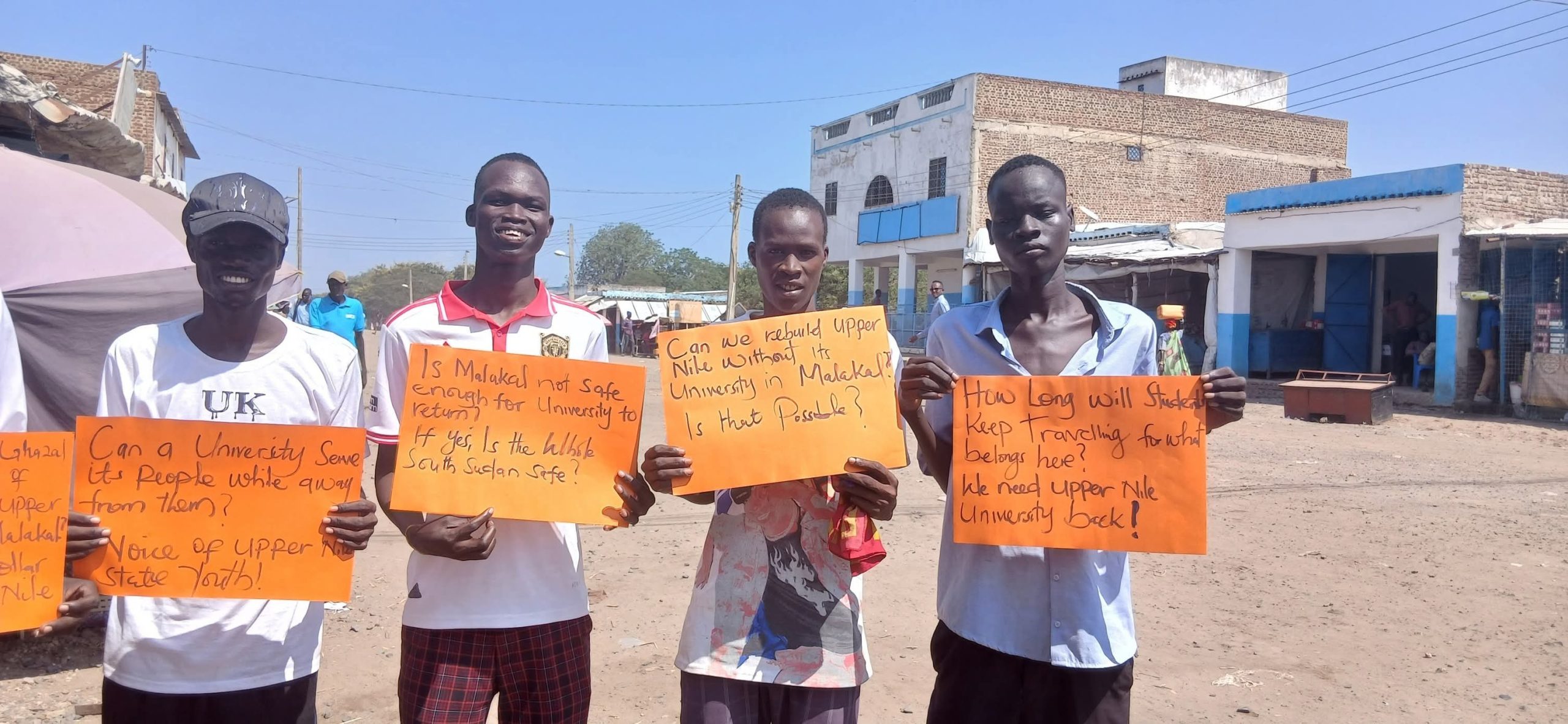 One of the banners read, “Is Malakal not safe enough for the university to return? If so, is South Sudan as a whole safe?”—a statement rejecting the security-related justifications delaying the university’s return.