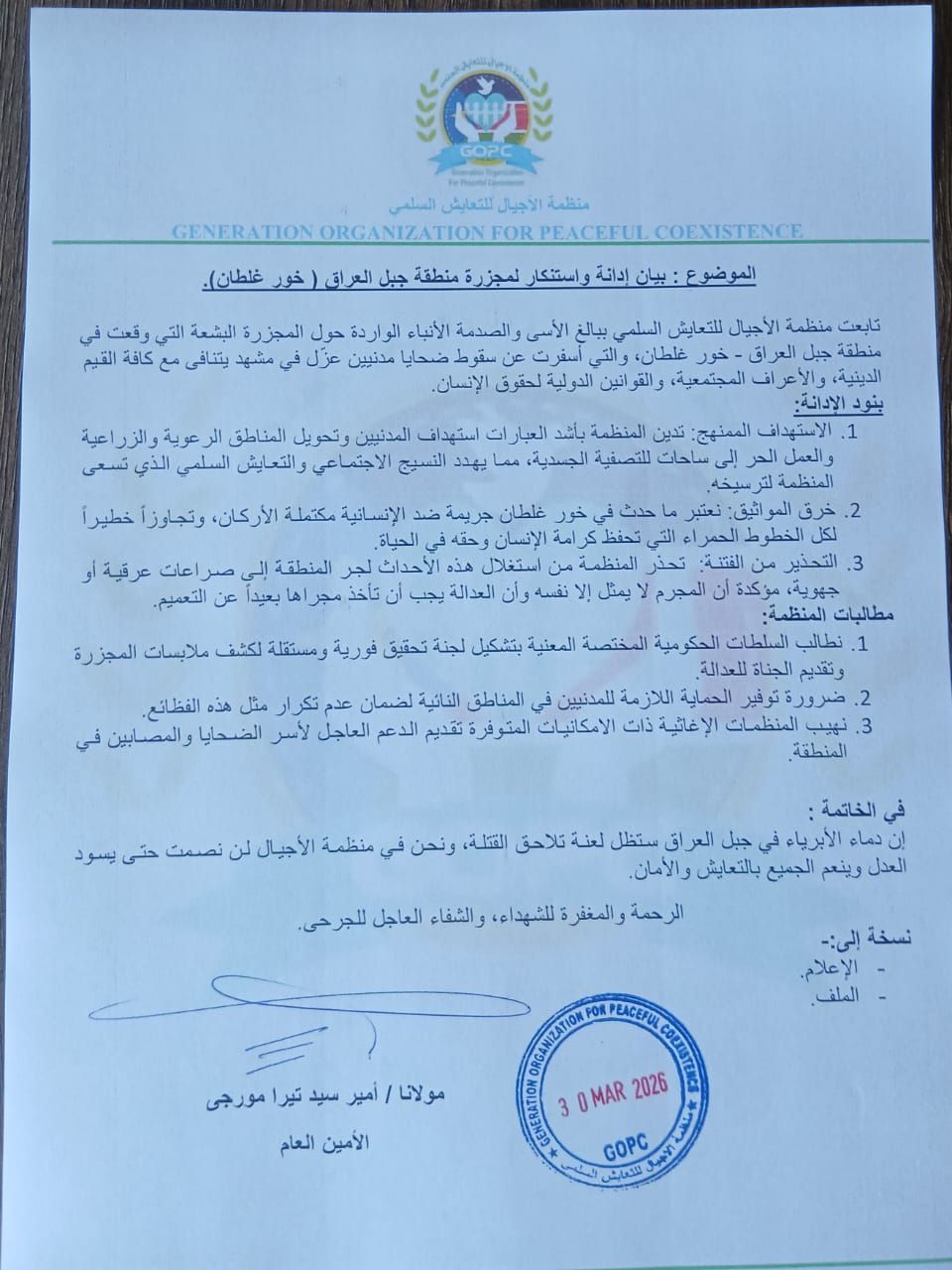 The organization Future Generations for Peaceful Coexistence condemned the massacre that took place in the Jabal Iraq area (Khura Ghaltan), which resulted in the death of dozens of civilians working in traditional gold mining. The incident has sparked a wave of anger and concern in local communities.
