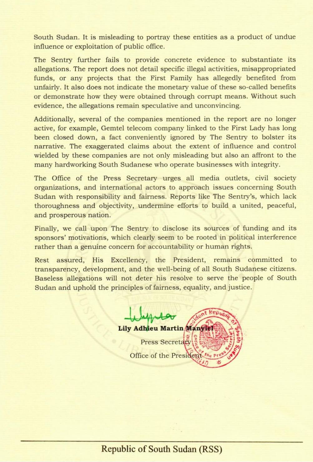 The Press Office of the President issued a press statement, a copy of which was obtained by (DERAWET MEDIA), refuting the allegations made in the “The Sentry” report against President Salva Kiir Mayardit and members of his family. Above is the attached press statement.